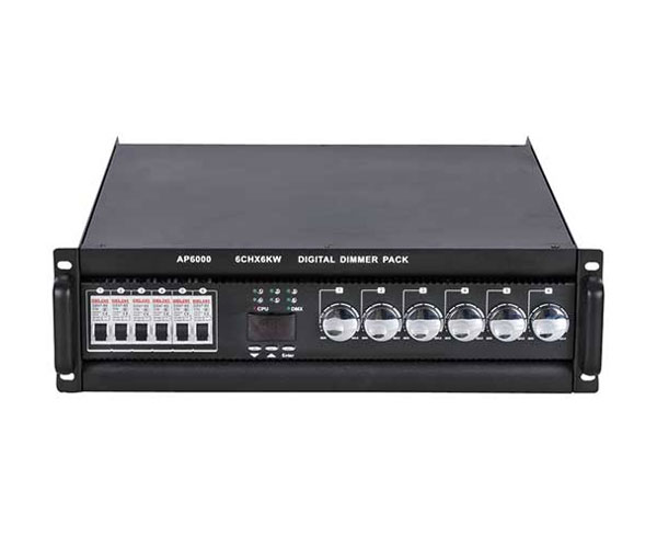 具有6路旋钮调光,调光范围为1%-100%,也可设为开关状态或调光状态.开关状态下其开关值为50%满亮数字DMX512信号起始地址为001.可设最大512信号可设为保持或不保持工作方式。在保持状态下,如控制台DMX信号中断,将保持最后信号控制信息,永不暗场.(出厂默认为保持)设有24个场景可记录、备份、运行